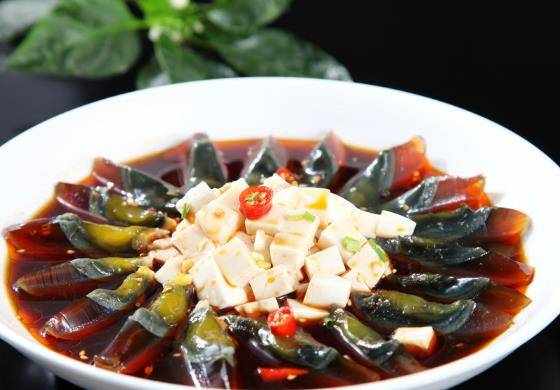 4、皮蛋拌豆腐。將皮蛋剝殼,切好。然後可以在切好的蒜裡面懂點醬油,撒在皮蛋上。