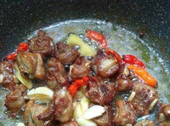 第四步:這時候加入薑、蒜、辣椒、花椒煸香之後,倒入米酒蓋鍋20秒,然後再加入生抽翻炒至排骨色勻。