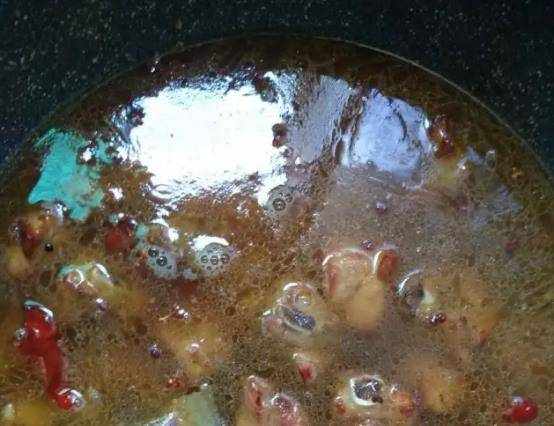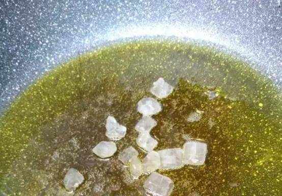 第二步:起鍋燒油,待油溫燒至五成時,把冰糖下鍋,關小火,這時候冰糖開始逐漸融化顏色慢慢變深,當出現很多的小泡時,糖色就炒好瞭。