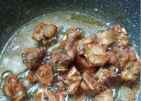 第三步:糖色炒好之後迅速的把排骨放進去,翻炒上色,一直炒到排骨表面金黃,微微發焦的狀態。