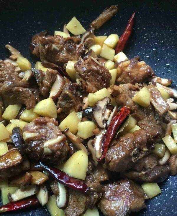 清洗幹凈的排骨控幹水分以後撈出來倒入鍋裡面,再開大火煸炒兩分鐘,炒出裡面的油脂以後,再加入蔥薑香葉和八角,再把調好的料汁加入進來,再加入半罐啤酒去異增香,還能夠很好的軟化肉質,接著倒入一碗白開水,這裡一定要用開水,再放入泡發好的香鍋,蓋上蓋子開中小火燜半個小時。