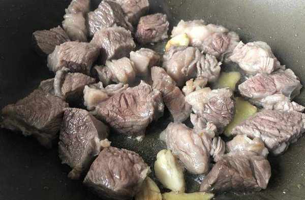 第二步,準備一個幹凈的鍋,倒入適量油,然後放入薑蒜爆香,再加牛腩翻炒片刻。