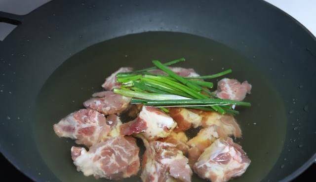 1.將食材全都準備出來,排骨清洗幹凈,然後冷水下鍋,再倒入1勺料酒和一把蔥段,開大火煮開,這樣能去除排骨的血水和腥味。