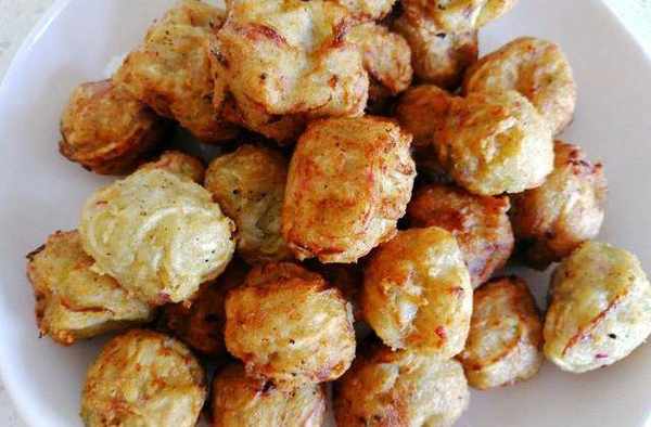 4.鍋中倒油,等油熱瞭後,用虎口擠出一個個丸子放到鍋中炸,全程保持中小火,如果火太大瞭,就容易造成表皮熟瞭,但裡面沒熟,等丸子全都變成金黃後,就可以撈出來瞭,外酥裡嫩,越嚼越香,頓頓都吃不膩!