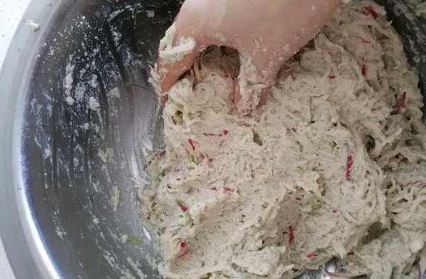 2.待蘿卜的水醃制出來後,擠幹水分放到一旁備用,碗中放面粉,加適量的水給攪拌成糊狀,不要太稀也不要太幹,然後將所有食材全都放進去攪拌均勻,因為蘿卜是用鹽醃制的,大傢可以不用放鹽,加點胡椒粉調味就可以瞭。