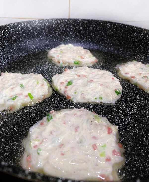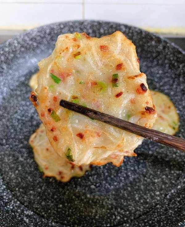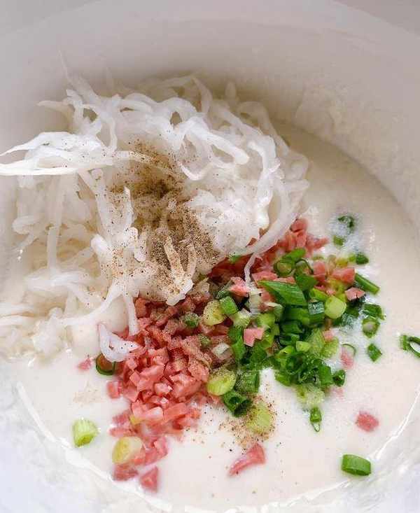 食材:白蘿卜、火腿腸、面粉、鹽、油、胡椒粉、蔥