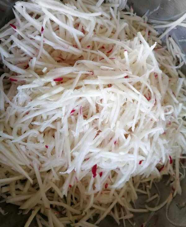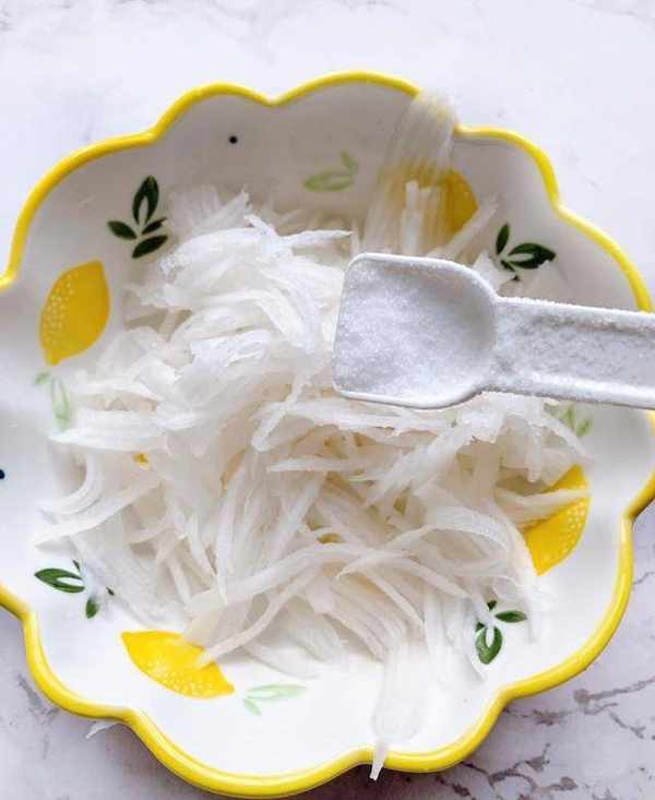 1.準備一根白蘿卜,去皮擦成絲放到碗中,加入適量的鹽,將裡面的水分殺出來,蘿卜處理好瞭後,將蔥和火腿腸切丁,如果有胡蘿卜的話,也可以再放點胡蘿卜,不僅好看還好吃。