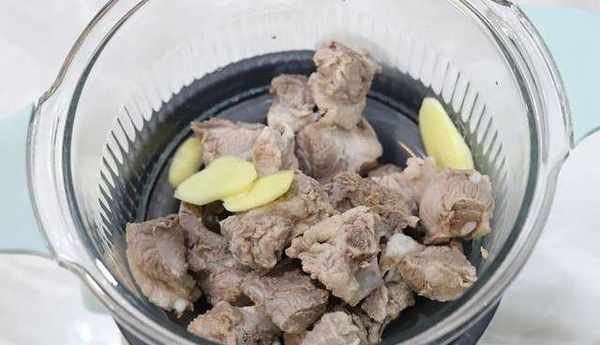 2.在焯煮排骨時,將白蘿卜去皮切成滾刀塊放一旁備用,等排骨焯煮好瞭後,溫水沖洗,再放到燉鍋中,加入生薑,先燉40分鐘。