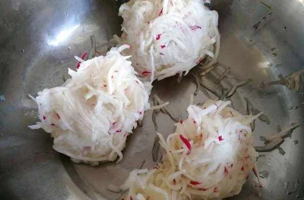 1.將上面食材全都準備出來,如果沒有豆腐渣,用老豆腐一樣,每當天氣冷瞭,北方人就會做這個丸子。然後將蘿卜去皮擦絲,再放鹽醃制一下,將蘿卜的水都殺出來。