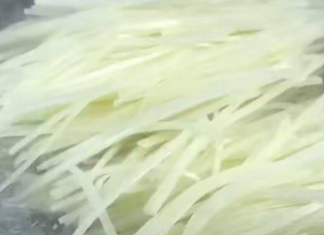 第一步、鍋中倒入適量清水,待水燒開後,倒入土豆絲焯水1分鐘,然後撈出,濾幹水分備用。