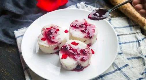 山藥蒸好後,出鍋放涼。有條件的,用好看模具塑形,淋上藍莓醬,就可以吃瞭。這款甜品,冷熱都好吃,清甜不膩,又有營養。