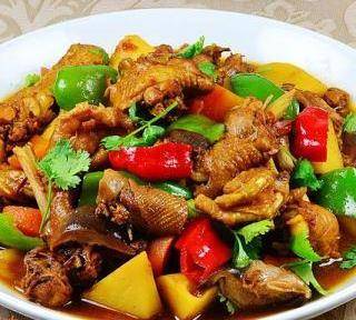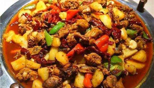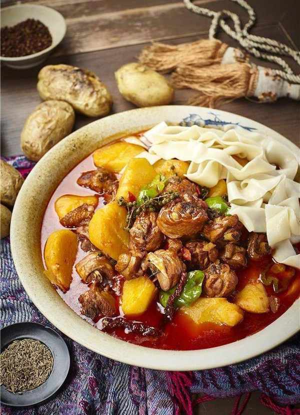 新疆大盤雞,是新疆特色菜看。成菜色澤鮮艷,雞肉滑嫩,麻辣鮮香。