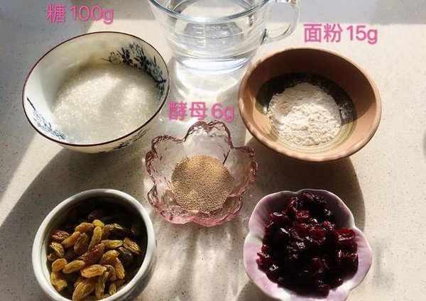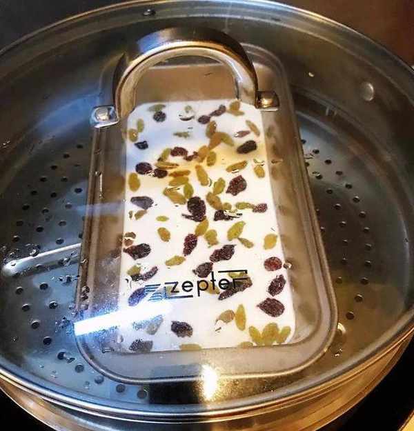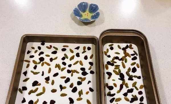 準備好的容器底部刷一層油,將米漿倒入容器5分滿,再撒上葡萄幹和蔓越莓,再震幾下,將氣泡震出後靜置2分鐘