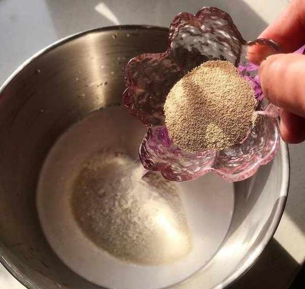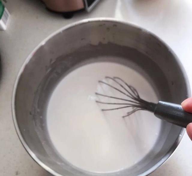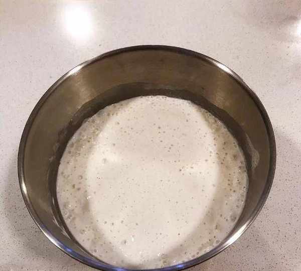 蓋上保鮮膜發酵40分鐘左右(可以放在溫水裡的蒸架上或者太陽下),發酵至很多氣泡的時候,將氣泡攪拌至順滑無氣泡