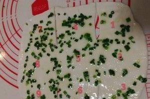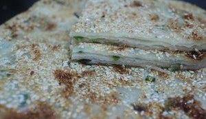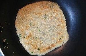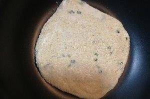 平底鍋燒熱,到少許油1,放入搟開的面餅;