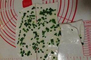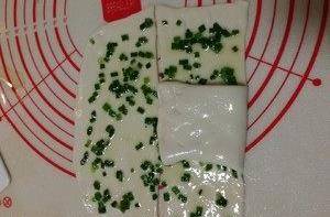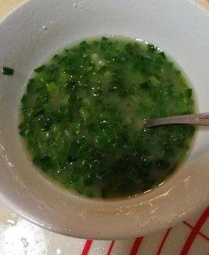 趁這時候做蔥油酥,小蔥取綠蔥葉洗凈切碎放入碗中,鍋中燒油,油要稍多一些,燒至有些冒煙後倒入裝蔥花的碗中,過兩分鐘後再放少許面粉在蔥油碗中,拌勻,就是蔥油酥瞭;