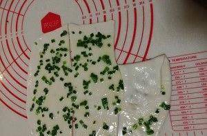 取一個面團,搟開,倒上四分之一蔥油酥,再放少許鹽在蔥油酥上抹勻,再將面餅上面三分之一切兩刀,下面三分之一切兩刀,如圖,中間三分之一不切開;