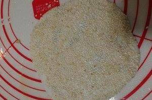 醒15分鐘,將面團上抹少許水,粘上芝麻,搟開;