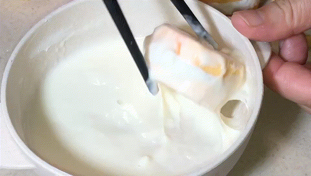 4.碗裡準備少許淀粉和面粉,用清水攪拌成面糊。把做好的紅薯夾心餅先沾上一層面糊。