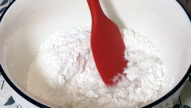 2.準備糯米粉150克加入10克白糖,然後用100克微燙的溫水,邊倒邊攪,攪好以後,揉成光滑糯米團。