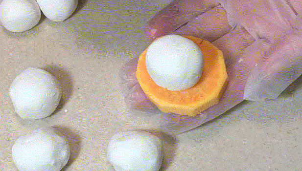 3.揪一團糯米面團揉圓壓扁,用兩片紅薯夾心並按壓。