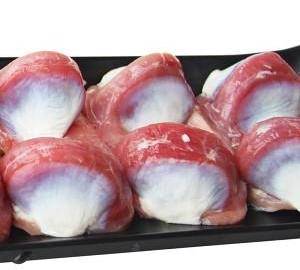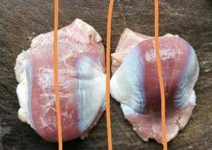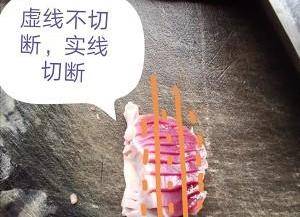 3、切斷後,白色面朝下,切薄片,底部是沒有切斷的。然後如圖所示,第一刀不切斷,第二刀切斷。就是鴨胗花刀的切法瞭……(我下次不為難自己瞭,直接切片╮(╯_╰)╭)