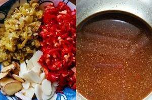 6、薑,大蒜切片,泡椒(前面泡瞭鳳爪的,可以炒菜,不浪費)紅椒剁細。旁邊是調的料汁(鴨胗需要快炒,所以調好料汁,減短烹飪時間)鹽適量,生抽1小勺,老抽一點上色,十三香1小勺,耗油適量,雞精1小勺,淀粉1小勺,料酒15克左右拌勻備用。