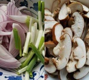 5、大蔥切段,洋蔥切絲,香菇切片。配菜可按自己喜好搭配,比如長條辣椒,甜椒,芹菜,韭黃……等等等等……
