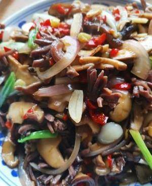 7、蘑菇類,我都怕不炒熟吃瞭會中毒,所以我先用少量的油,炒瞭一下香菇,盛出備用。熱鍋冷油,油溫上來後,下鴨胗,炒到變色放入薑蒜辣椒那一盤佐料,翻炒均勻。倒入香菇,大蔥洋蔥,翻炒片刻,倒入事先調好的料汁,翻炒均勻即可出鍋。