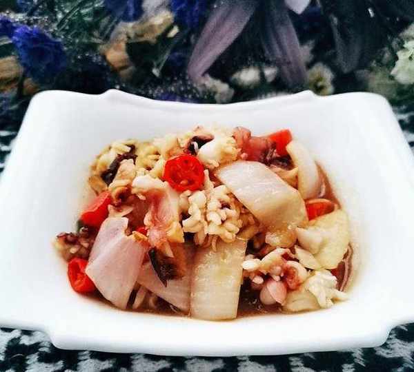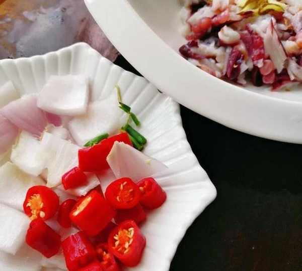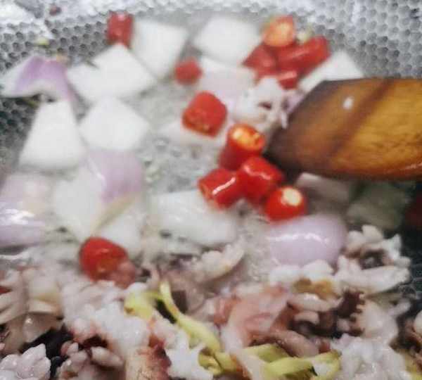 原料:魷魚須、紅辣椒、薑、大蒜頭、洋蔥、油、鹽、雞精、蠔油、胡椒粉、米酒。