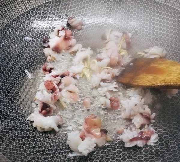 第4步、起鍋燒油,油七成熱時,下入魷魚須和薑絲快速翻炒變色。