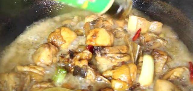 放入雞塊,放入香料,快速的翻炒三分鐘左右,把雞塊炒至上色,把香料炒香。加入一瓶啤酒。放入生抽,蠔油放入適量的鹽,放入少許胡椒粉。攪動一下,把調料攪拌均勻。