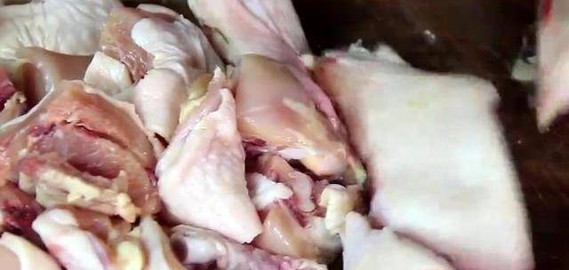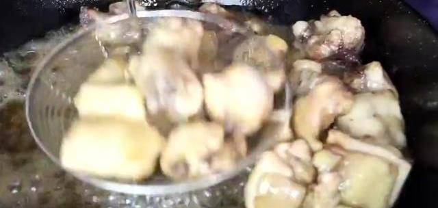 今天做道炒雞色澤紅亮,肉質緊實不才,非常的好吃,做法也非常簡單。首先我們把雞大腿剁成大小合適的塊。鍋中燒油,油溫七八成熱放入剁好的雞塊,高油溫可以使雞肉肉質緊實,也可以把雞肉表面沒有去幹凈的絨毛去掉。