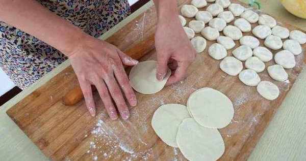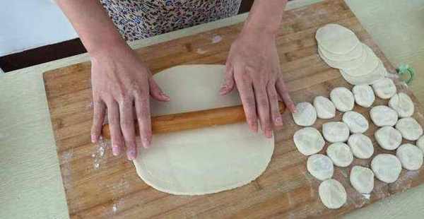 7.把摞好的餃子皮,用手壓扁,再用搟面杖搟大,搟圓。