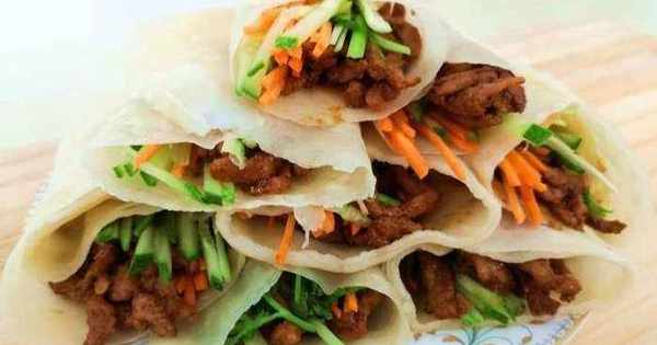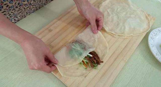 12.取一張薄餅,加入適量的肉絲,蔥絲,胡蘿卜絲,黃瓜絲,把面皮向上對折,再把左右對折。