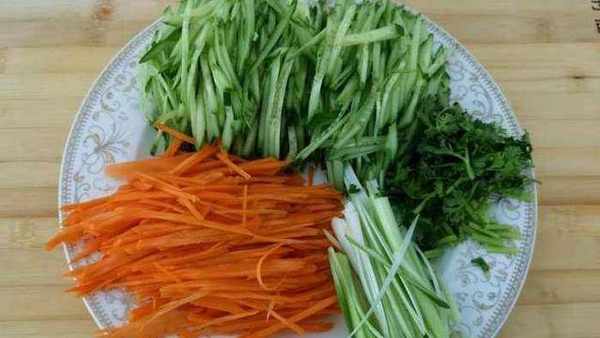 4.香菜切段,切蔥絲,黃瓜絲,胡蘿卜絲裝盤備用。