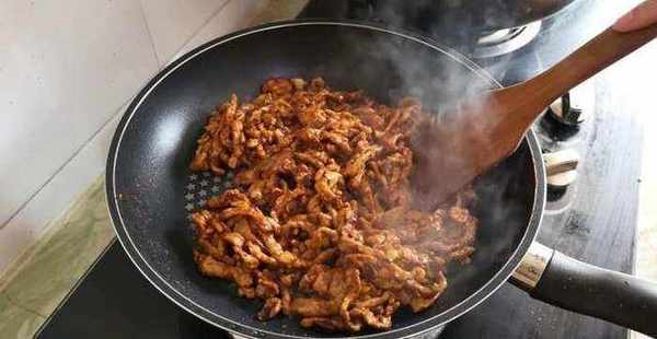 10.鍋內加油,下入肉絲,加入兩勺豆瓣醬,翻炒均勻。