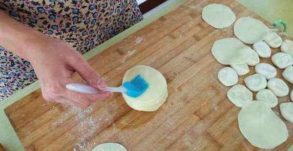 6.取一張餃子皮,上面雙一層油,再摞上一個餃子皮,再雙一層油,依次摞15-16層即可。