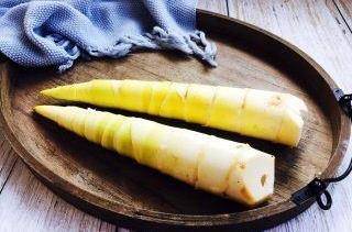 4.將春筍的筍衣剝去,切去一小部分較老的根部。
