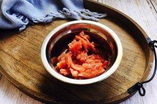 8.將輔助食材紅色的彩椒切成絲。