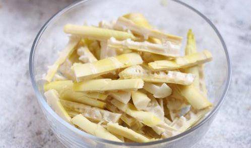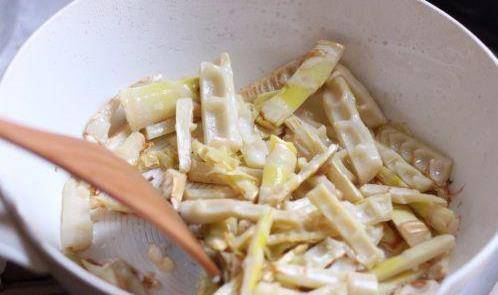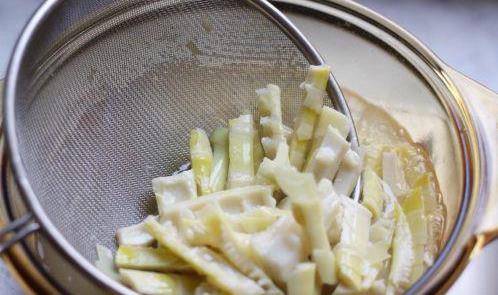 燒開一鍋水,加些許鹽和油,將筍放入焯兩分鐘,除去筍的草酸。