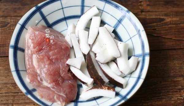 椰子,一般在市場都能買到新鮮的,椰子產自亞熱帶,椰子水特別能清熱還解渴,把椰子水倒出後,葉子肉切成條狀。廣東人喜歡用瘦肉煲湯,因為瘦肉脂肪少,用來煲湯不會太油膩,選瘦肉頭或者裡脊肉部分都可以。