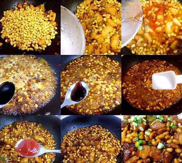 不斷翻炒至香,放入泡發好的黃豆,再倒入一碗水和提前熬制好的紅糖水,兩勺老抽,少量蠔油,適量鹽巴,翻炒均勻,蓋上鍋蓋小火燜煮20分鐘,待水份快幹的時候,放入兩勺番茄醬,翻炒均勻起鍋,起鍋後撒入幾粒蔥花便可以瞭。