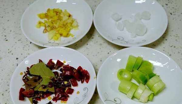 準備好輔材,大蔥切段,幹辣椒切段,幾粒花椒粒,薑蒜切末,準備兩片香葉、八角和幾塊冰糖。