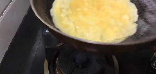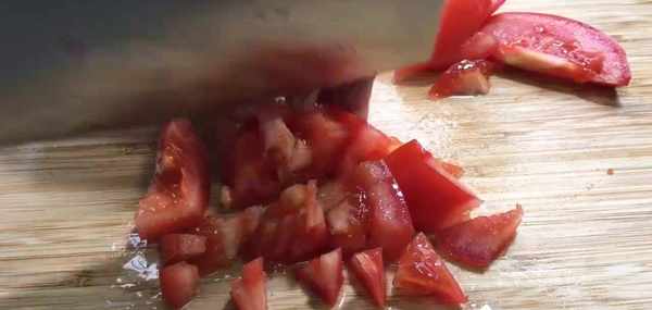 準備一個西紅柿中間切開,然後切進碎丁,裝進碗裡備用。再來準備一個幹凈的碗,打兩個雞蛋,加一點點開水,再放料酒去除蛋腥味,攪拌均勻放一邊備用。起鍋放油,倒進雞蛋液,小火煎至凝固裝進盤裡。