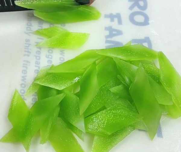 1、首先將萵筍洗凈去皮,改刀切成菱形片備用。