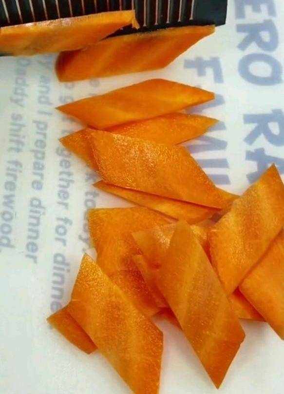 2、胡蘿卜洗凈,切成菱形片,用作搭配顏色。
