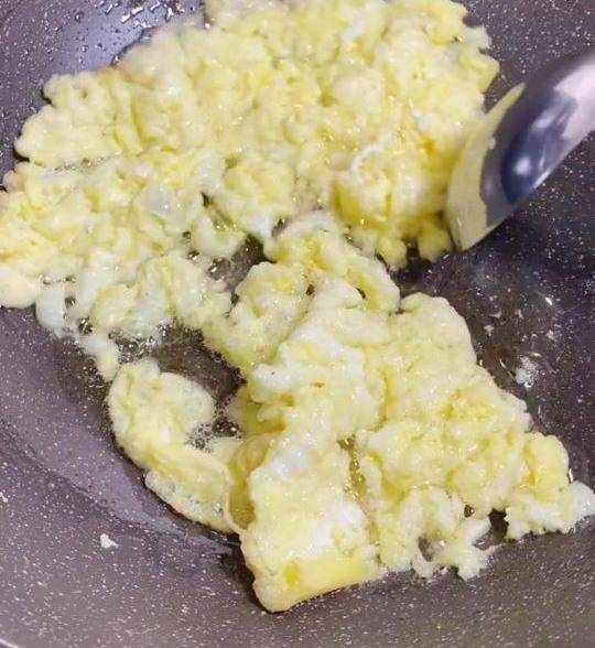 4、油熱下入雞蛋液炒散炒熟盛出備用。