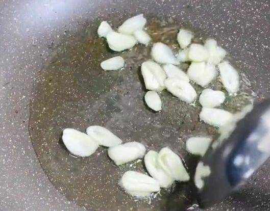5、起鍋燒油,油熱放入蒜片炒出香味兒;