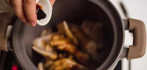 將雞肉和所有配料、調料一並放入瓦罐中,加入沒過雞肉的清水,瓦罐放在電陶爐上。